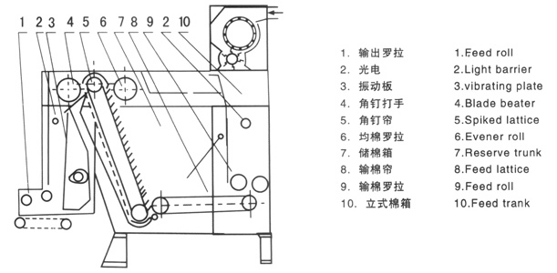 用于將配棉器輸送來的纖維(各種等級的原棉或化纖),作進一步開松、混合、并處理成均勻的筵棉,喂入成卷機制成棉卷。本機可和各型號的單打手成卷機聯接使用。