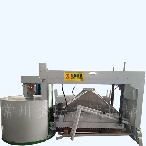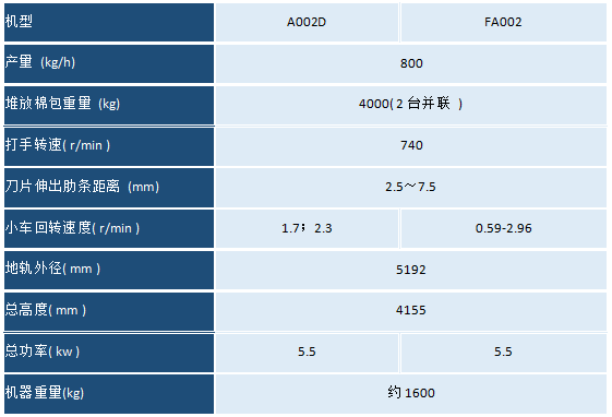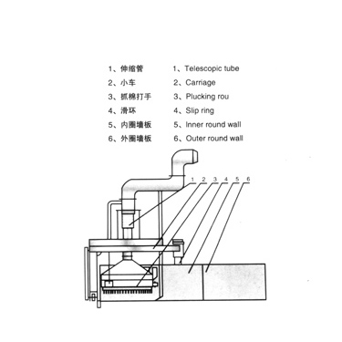 本產品排列于開清棉機的一道式序,適用于加工棉、棉型化纖和中長化纖,可兩臺并聯使用,其中一臺抓棉機抓頂部纖維,另一臺抓棉機抓底部纖維或兩臺同時抓中部纖維。間隙下降的抓棉機打手隨小車運轉作順序抓取。被抓取的纖維束塊籍風機抽吸經輸棉管道送至下部機臺。