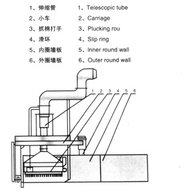 本產品排列于開清棉機的一道式序,適用于加工棉、棉型化纖和中長化纖,可兩臺并聯使用,其中一臺抓棉機抓頂部纖維,另一臺抓棉機抓底部纖維或兩臺同時抓中部纖維。間隙下降的抓棉機打手隨小車運轉作順序抓取。被抓取的纖維束塊籍風機抽吸經輸棉管道送至下部機臺。
