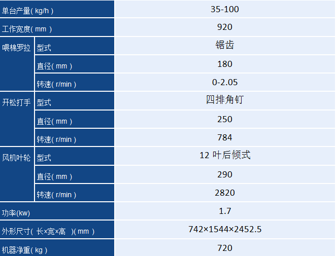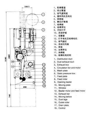 本機是梳棉機于清棉機組之間的連接裝置。采用上下棉箱結構,整體剛性好,精度、密封性好。在配棉總管中,設有壓力傳感器,保證了上棉箱內棉花密度均勻。下棉箱采用風機和通過靜壓擴散而循環吹氣,使整個機幅內下棉箱壓力均勻。采用進口壓力傳感器,根據下棉箱壓力來控制上棉箱給棉羅拉速度,保證了下棉箱壓力更穩定。采用順向喂棉、彈性握持。采用螺旋排列梳針打手,纖維損傷小。