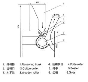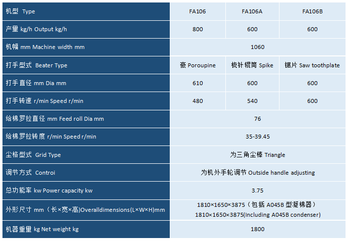 本產品在開清棉組中對經初步開松的原棉或化纖做進一步的開松或除雜,由于加工原料 不同,本機的結構與性能也略異,FA106與FA106A多用于化纖,FA106B的多用于加工各種等級的原棉。